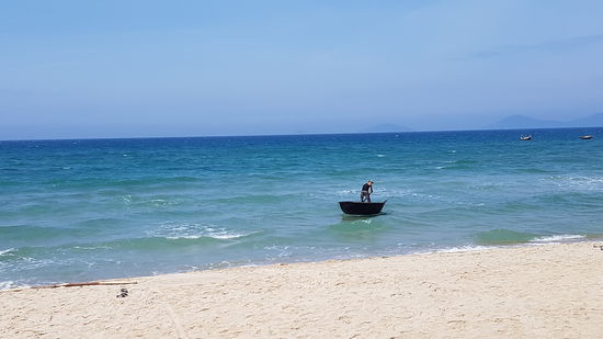 Wir haben uns hier für 2 Tage Motorroller gemietet, da es fürs Radfahren auf Dauer echt zu heiss ist und wir nicht völlig erledigt zu den Kleidungsanproben fahren wollten. Somit sind wir einen Tag die Strandstrasse entlang nach Cua Dai bis zum Leuchtturm gefahren. Während anfänglich noch richtig pompöse (und wir haben es online gesehen: auch richtig teure) Strandresorts anzutreffen sind, zeigt sich ab einem bestimmten Punkt ein sehr trostloses Bild dieser Strandlandschaft. Man fährt plötzlich an einer Vielzahl grosser Strandresorts vorbei, die anscheinend mitten im Bau unterbrochen wurden und nun verfalken. Wir nehmen an, dass den Bauherren hier irgendwann das Geld ausgegangen ist. Zum Teil werden die Strandhäuser bereits vom Meer unterspült und stürzen vom Wasser zusammen - ein trauriges Bild. Wir sind zurück zu unserem Strandabschnitt gefahren, wo man traumhaft liegen kann und von diesem Verfall absolut nicht mitbekommt. Was übrigens sehr amüsant anzusehen ist, sind die Nussschalen, mit denen hier die Fischer zum Teil in See stechen. Es sind kleine Boote, die komplett rund (also kein bisschen stromlinienförmig) und mit nur einem Ruder ausgestattet sind. Es ist echt eine Kunst, bei der hiesigen starken Strömung das Boot genau dorthin zu befördern, wo man es haben möchte. Aber die Fischer haben irgendwie eine Technik und es funktioniert. Für uns ist es interessant anzusehen.