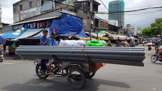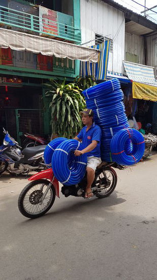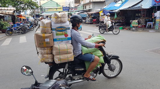 Je näher wir zum Binh-Tay-Markt kamen, umso geschäftiger wurde das Treiben. Die Leute bugsierten auf ihren Motorrollern eine Masse an Materialien, Kartons etc, bei denen in Deutschland jeder Kombi-Fahrer abgewunken hätte. Aber hier geht es nunmal nicht anders. Der Binh-Tay-Markt ist ein Markt etwas anderer Art, ist er doch eher ein Grossmarkt. Die Einheimischen kaufen hier grössere Mengen ein, um sie in ihren eigenen Geschäften weiter zu verkaufen. Daher auch die Rollerfahrer mit den riesigen Lademengen. Der Markt wird im Lonely Planet als architektonisches Meisterstück beschrieben, was wir als etwas übertrieben ansehen würden. Trotzdem ist er irgendwo schön und (und das haben wir in keinem Markt auf unserer Reise bisher gesehen) sogar auf 2 Etagen verteilt mit einem Innenhof im Zentrum. Die Gänge sind unglaublich eng und Andreas hatte keine Chance auszuweichen, als eine Verkäuferin gerade ihr ganzes Fisch-Wasser über den Gang kippte - wir müssen mal gucken, wie wir diesen Gestank bis morgen zum Flug wieder aus den Schuhen raus kriegen. Als wir auf dem Markt waren, brach ein Monsunregen los, der wie wild durch die Strassen peitschte. Da wurde es bei den aussen liegenden Geschäften etwas hektisch bei der Abdeckung und Sicherung der Waren. Anschliessend wurde wild weiter verkauft. Da wir keine 10 Flaschen Sojasosse, 20 Original Hilfiger Caps oder kiloweise getrocknete Garnele (das Zeug stinkt bestialisch) brauchten, haben wir den Markt einfach nur durchstöbernd genossen aber nichts gekauft. Wobei wir vermutlich, wenn wir gefragt hätten, auch kleinere Mengen bekommen hätten (als Tourist dann natürlich zum gleichen Preis wie das grosse Paket).
