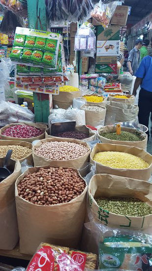 Wir besichtigten dann erst mal zwei Pagoden, die Thien-Hau-Pagode und die Nghia-An-Hoi-Quan-Pagode, die beide wirklich sehenswert sind. Anschliessend wollten wir noch die nahe gelegene Cholon-Jamail-Moschee besichtigen, da jedoch die Schilder bezüglich der Zutrittsrechte für Frauen etwas unklar waren, haben wir es bei einer Besichtigung von aussen belassen. Danach sind wir quer durch das Viertel Cholon Richtung Binh-Tay-Markt gelaufen und obwohl die Sonne von Wolken verdeckt wurde, war es irre heiss. Auch Saigon scheint Themenstrassen zu haben. So haben wir in einem Strassenabschnitt diverse Papierläden passiert, in einem weiteren gab es diverse Lampions und in einer anderen Ecke waren vor den Geschäften säckeweise Kräuter und getrocknete Pilze ausgestellt. In einer weiteren Strassenecke gab es Fischereizubehör, in der nächsten wiederum Eisenwaren und Farben. Es war schön anzusehen. Nur der eigentlich weisse kleine Hund mit lila Rücken, der uns über den Weg lief, sah aus, als wäre in irgendeinem der Farbenläden in seinem Beisein ein Unfall passiert.