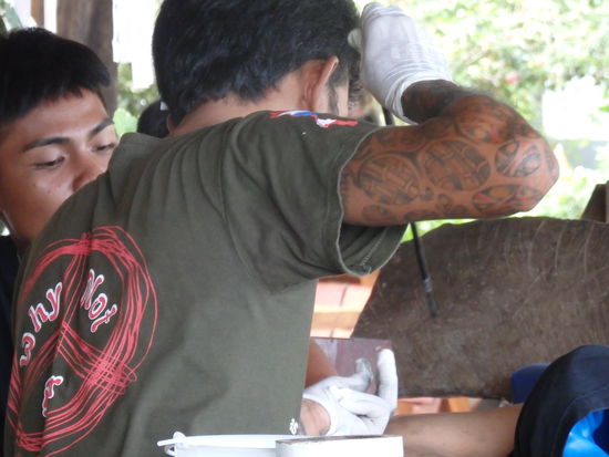 Er wurde nach alter Tradition „Bamboo“ gestochen. Was eine Maschine 100-200-fach schneller macht, wird auf diese Art und Weise schöööön langsam gestochen, da hat man länger am Schmerz.