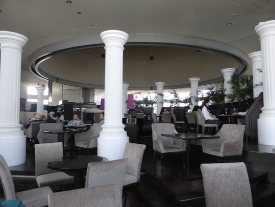 Ein kurzer Blick in unsere Taschen und dann dürfen wir nach oben. Erinnerungen an das UN-Gebäude in New York werden wach. Das Restaurant ist überhaupt nicht busy , sondern ganz toll angelegt mit kleinen Tischen.