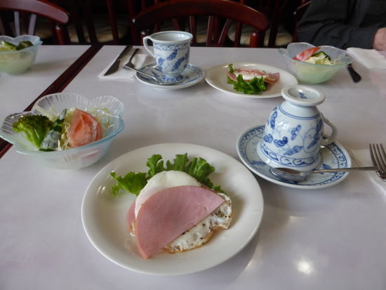 Also die Frage ist geklärt: auf den Bauch rollen, dann über die Knie aufstehen. Der Wecker klingelt um 7 – ich überlasse meiner Frau Ulrike das Waschbecken und verziehe mich in den Onsen. Dort ist die morgendliche Waschung einfacher. Das Frühstück um 8 findet wieder in einem anderen Raum statt. Heute gibt es ‚westliches’ Frühstück bestehend aus Rührei (hübsch dekoriert), vorgebutterten Toast und Marmelade.