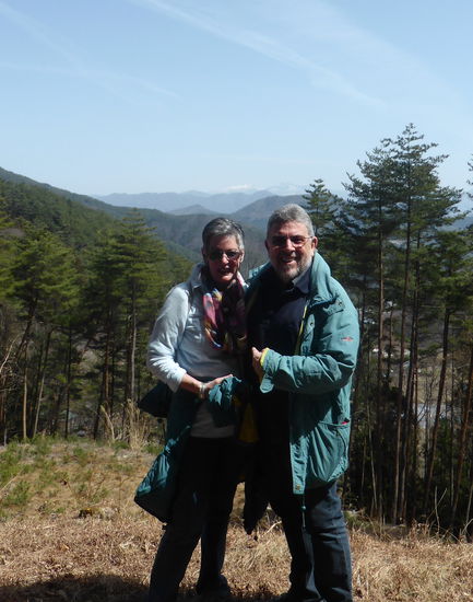 Ersten Stop legen wir an einer Aussichtsplattform ein mit Blick auf das langgezogenen Tal. Danach führt der Weg in den Wald und steigt stetig an. Am höchsten Punkt bei ca.850 m Höhe haben wir einen schönen Blick auf schneebedeckte Berge.