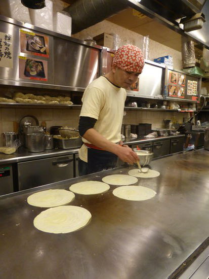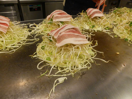Wie im Daitokai, nur preiswerter sitzen wir zu siebt vor einem Teppanyaki-Grill und der Meister der Okonomiyaki tropft Pfannkuchenteig auf die Platte, dann schichtet er Weißkohl darüber, dann Sojasprossen, noch etwas undefinierbares ‚Gebrösel’ , sodann legt er Speck darüber und wendet die ganz Chose.