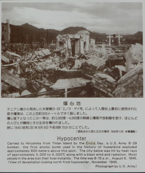 An der Brücke zum Friedenspark marschieren wir zunächst zum Friedensdenkmal - der Atombombenkuppel. Wegen des englischen Ausdrucks 'Atomic Bomb Dome' wird das Denkmal oft fälschlicherweise auch mit Atombombendom bezeichnet. Abbildungen veranschaulichen das verheerende Geschehen und geben auch Fakten wider.