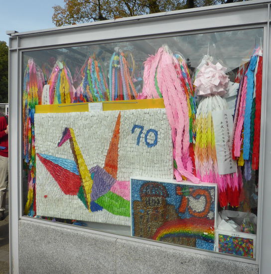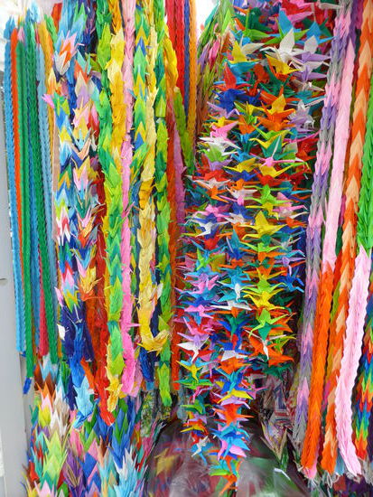Am Denkmal des überlebenden Mädchens Sadako bewundern wir die jährlich von Kindern hergestellten Kraniche. Sadako war zwei Jahre alt, als sie von den Strahlen der Bombe getroffen wurde. Mit 10 jahren erkrankte sie an Leukämie und wurde ins Rote-Kreutz-Krankenhaus aufgenommen. Mit den Schmerzen der Krankheit kämpfend, faltete sie viele Kraniche in der Hoffnung auf Gesundung. Sie verlor den achtmonatigem Kampf. Ihre Geschichte wurde zu einem Symbol der internationalen Friedensbewegung und des Widerstandes gegen den Atomkrieg.