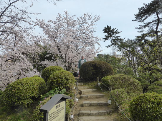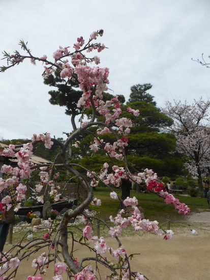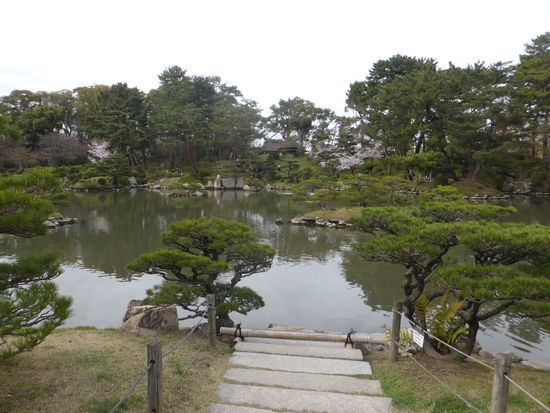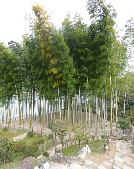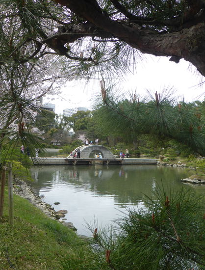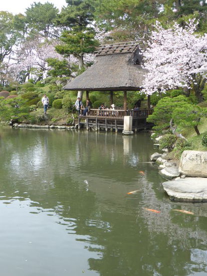 Über Brückchen laufen wir einen Schlängelweg durch den Park und können uns nicht sattsehen an den blühenden Kirschbäumen, den Koys im Wasser und dem Bambuswald.