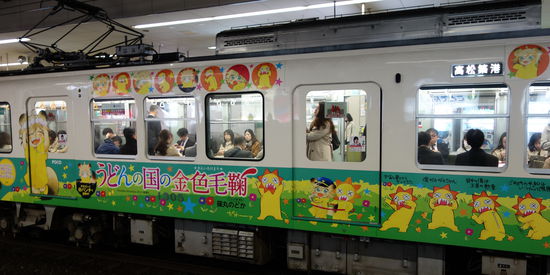 Als wir um 7.15 Uhr zum Frühstück erscheinen, ist schon keine Marmelade mehr da, doch Ulrike hat die Idee mit Zucker auf dem Schlabbertoast. Das ersetzt die Marmelade und für das Omelette gibt es sogar Gabeln. Pünktlich um 8.15 Uhr marschieren wir gemeinsam zur lokalen Eisenbahnstation. Von hier fahren drei Linien – farblich gekennzeichnet – jeweils eine Kurzstrecke – die gelbe fährt um 8.35 Uhr nach Kotohira. Auf dem Bahnsteig stehen (hübsch) bemalte Züge – nicht zu vergleichen mit dem Geschmiere auf deutschen Nahverkehrszügen.