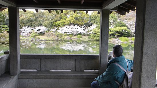 Der Ritsurin Park, der unter den als besonderes Kulturdenkmal des Landes ausgezeichneten Landschaftsgärten die größte Fläche besitzt, kombiniert auf raffinierte Weise 6 Teiche mit 13 künstlich angelegten Bergen vor dem dunklen Grün der Kiefern des Shiun Berges im Hintergrund.