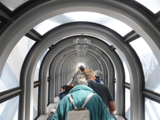 Schließlich fahren wir dann im Umeda-Skybuilding auf den 35. Stock, wo sich der 'floating garden' befindet, zwei Rolltreppen in jeweils einer Röhre, die zur ersten Aussichtsplattform des Gebäudes führen.
