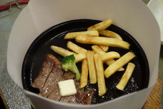 Ulrike wählt gebratenes Fleisch auf einer gusseisernen Platte (erinnert an sizzling fajitas in Mexiko) serviert mit Spritzschutz.