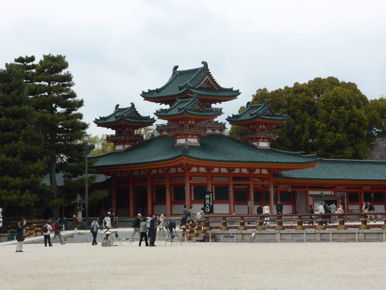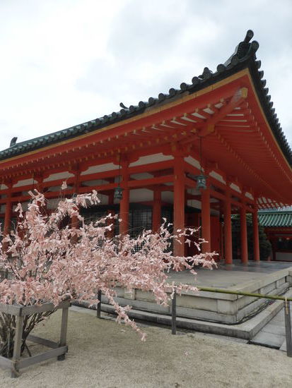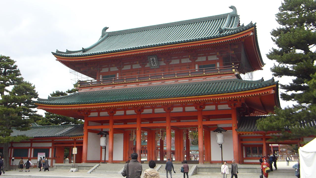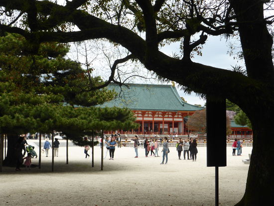 Der orangefarbene Nachbau des kaiserpalastes der kunstverliebten Heian-zeit wurde 1865 zu Kyotos 1100-Jahrfeier errichtet. Durch das rote Tor Otomon gelangt man zur zur großen Staatshalle Daigokuden, zu den östlichen und westlichen Haupthallen sowie zu den Pagoden. Dahinter liegt ein großer Teichgarten, in dem - anders als beid en immergrünen Zen-Gärten - je nach Jahreszeit unterschiedliche Bäume blühen.