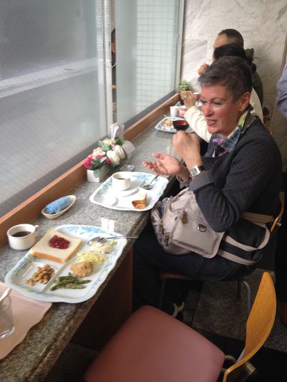 Um 7.30 Uhr kommen wir in die Lobby und schon wieder ist Gewusel. Der viel zu kleine Raum wird durch ein recht üppiges japanisches Buffet – außerdem gibt es (nur) Toast, Margarine und Marmelade - noch kleiner. Wir finden noch ein Plätzchen – Ulrike bleibt beim Toast – ich probiere Nudelsalat, grüne Bohnen mit Sesam und Weißkohlsalat – alles recht lecker.