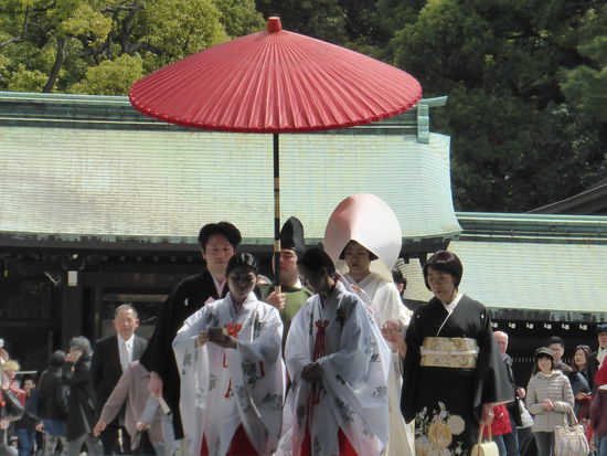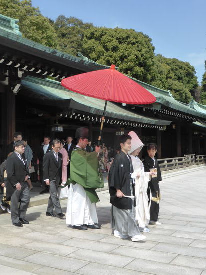 Beliebt ist der Meiji-Schrein vor allem für Hochzeiten, und mit etwas Glück kann man einen Blick auf ein festlich gekleidetes Brautpaar in traditionellen Kimonos erhaschen. Heute am Ostersonntag scheint es viele Trauungen zu geben.
