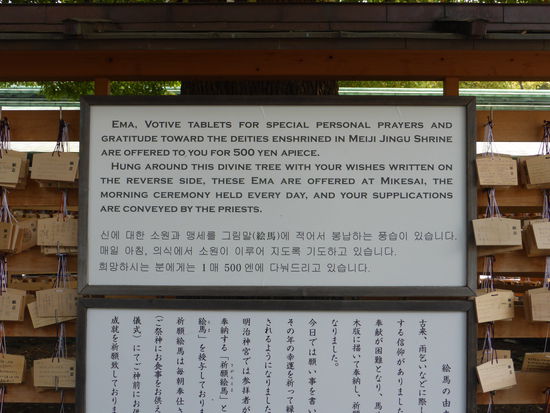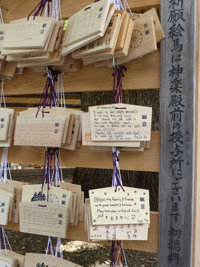 Für 500 Yen kann man kleine Holztäfelchen kaufen, auf die man seine Fürbitten fein säuberlich schreibt, um sie dann an eine Wand zu hängen. Sie sollen dann in Erfüllung gehen.