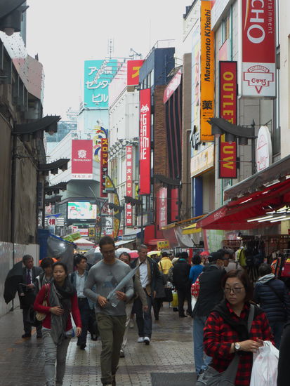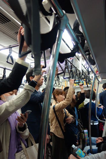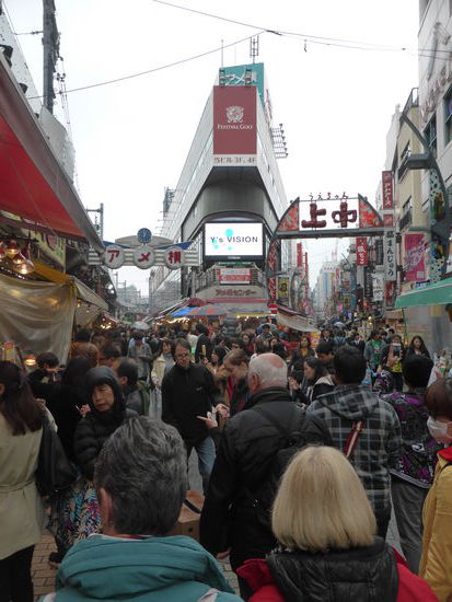 Früh aufstehen, d.h. 8.00 Uhr müssen wir uns schon am Bahnhof einfinden. Etwa eine Stunde brauchen wir bis Atami, wo wir (leider) in den nächsten Regionalzug einsteigen, der uns in zwei Stunden nach Tokyo Ueno bringt. Einzig auffälliges ist ein kleines Mädchen mit Katzenkniestrümpfen und mit LEDs ausgestattenen Schühchen. Ansonsten versucht alles zu pennen, es ist ein Zug, der je näher wir Tokyo kommen umso voller wird. dIe Leute sind überwiegend büromäßig gekleidet, d.h. dunkler Anzug, Hemd und Krawatte.