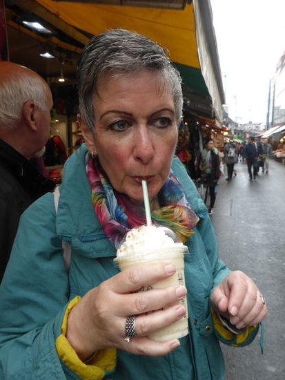 Genau dort, wo wir die ersten Yukata gesehen haben, finde auch einen. Ulrike probiert ein Bananensmoothie.