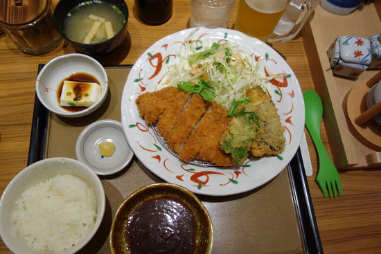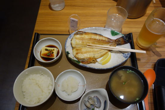 Im Bahnhofsgebäude finden wir dann auch ein Café, in dem viele kurz ausruhen und einen 10min-Schlaf nehmen. ( hinsetzen, Kopf runter und pennen). Wir fahren jetzt ins Hotel und packen den Rucksack wieder in der Koffer und um 18.00 Uhr gehen wir in das benachbarte nett eingerichtete Lokal. Am Tisch bedeutet man uns gestenreich, nach draußen/ vorne zu gehen. Erst dort begreifen wir, dass wir in einem Automatenrestaurant sitzen. Also erst Geld einschieben, vertrauensselig schiebe ich einen 5000yen-Schein und bestelle aus dem umfangreichen Kartenausschnitt Touchscreen, ein Bier, eine Muschelsuppe und einen aufgeklappten toten Fisch (Makrele), zu früh drücke ich die Entertaste und dann kommen drei Bons und das Wechselgeld raus. Also die ganze Prozedur noch einmal für Ulrike. Bier und Tempuraschnitzel.