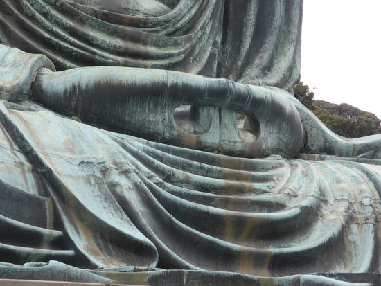 Wie bereits auf der Schautafel zu sehen ist, gilt unser erster Besuch dem Kōtoku-in mit der ab 1252 errichteten monumentalen Bronzestatue des Amida-Buddha, gewöhnlich „Daibutsu“ genannt. 1498 zerstörte ein Tsunami den ungefähr 860 m vom Strand entfernten Tempel und die den Großen Buddha umgebende Halle, seitdem steht die Figur frei.