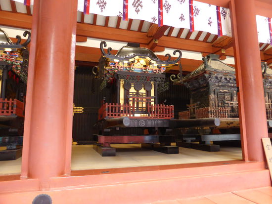 Es gibt eine Anzahl von Schreinen an diesem Ort, die wichtigsten sind der jüngere Schrein auf Erdniveau und der ältere Schrein 61 Stufen darüber. Der heutige "Ältere Schrein" wurde 1828 von Tokugawa Ienari, dem 11. Tokugawa-Shogun errichtet.
