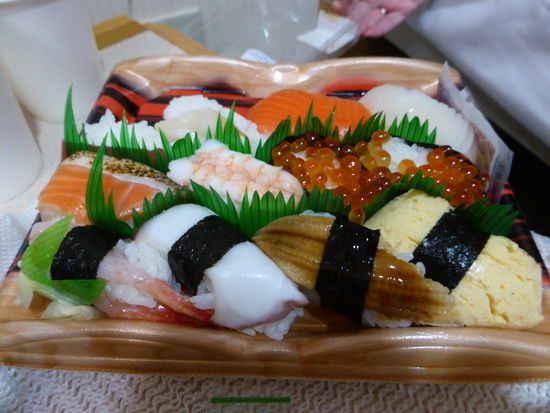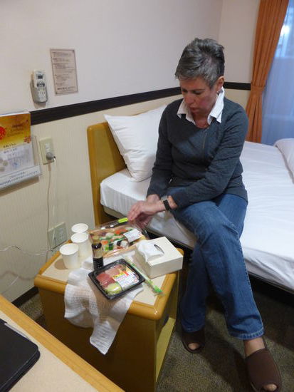 Zurück in Tokyo begehen wir Ulrikes Geburtstag - todmüde gelaufen - auf dem Zimmer mit einer Sushi-Sashimi-Platte und einer Flasche Weißwein.