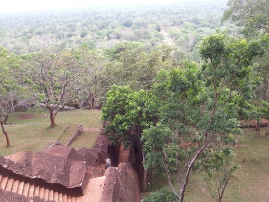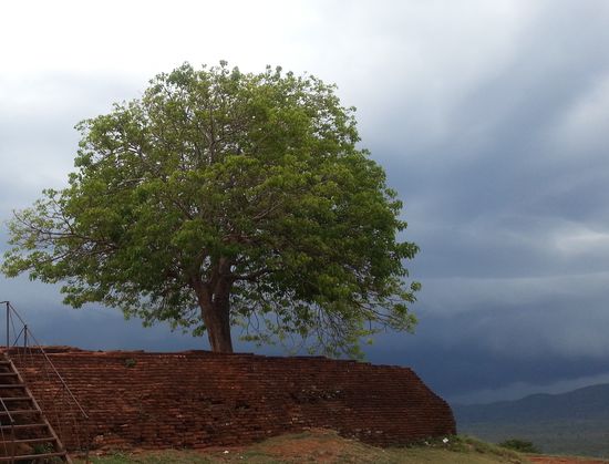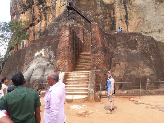 Zurück im Hotel beschliessen wir ganz spontan, doch noch heute auf den Lions Rock zu steigen und nicht erst morgen früh um 7:00. Rüdiger geht es ganz gut und deshalb schnappen wir uns ein TukTuk, fahren zum Haupteingang, zahlen über 4000 Rupies Eintritt pro Person und laufen los, ohne uns das Drumrum mit Museum Gärten noch groß anzuschauen. Der Himmel wird immer dunkler und von Weitem hört man auch schon das tägliche Gewitter nahen. Der Aufstieg ist nichts für Menschen mit Höhenangst und ich darf an manchen Stellen auch einfach nicht darüber nachdenken, wo ich bin. Wer jemals eine Tour über die Dächer des Kölner Doms gemacht hat kennt die schmiedeeiserne Wendeltreppe dort...jetzt stellt euch das Ganze einfach freischwebend an einer Felssteilwand vor! Anfangs geht es über Steintreppen hoch, dann kommt die Wendeltreppe die aber "nur" zu den Wandmalereien der Wolkenmädchen führt und dann wieder runter und weiter zum Gipfel. Die Fresken sind wirklich schön und wahrscheinlich eine Darstellung der königlichen Konkubinen aus dem 5.Jhd. Wildes Leben, das die Könige da so geführt haben.