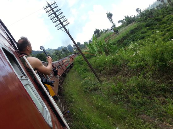 Wir haben für 1000 Rupies Sitzplätze im Observation Wagon gebucht obwohl wir eigentlich 2.Klasse fahren wollten weil wir gehört hatten, dass man in der 1. die Fenster nicht öffnen kann, was aber offensichtlich nur für die neueren, blauen Züge gilt. Wir steigen pünktlich um 10:56 in einen alten roten Zug, dessen Klimaanlage in der 1.Klasse aus vier an der Decke montierten Ventilatoren besteht. Gewöhnungsbedürftig ist das Rückwärtsfahren weil hinten ein riesiges Panoramafenster ist, durch das man rausschauen kann. Die Fenster kann man alle öffnen und wir stehen die meiste Zeit an der offenen Tür und hängen im Fahrtwind. Der Zug fährt langsam durch eine großartige Landschaft an der höchsten Railwaystation Sri Lankas Pattipola mit knapp 1900 m vorbei und selbst ich hänge mich weit aus der Tür. Die Fahrt ist super! Man sieht unheimlich viel und es macht einfach Spaß, so durch die Gegend zu zuckeln, durch eine wechselnde Landschaft aus Bergen, Wäldern, Reisfeldern, Teeplantagen und winkenden Kindern. Ich hab übrigens beschlossen, nach unserer Rückkehr den Trockner abzuschaffen und unsere Wäsche demnächst auch einfach zum trocknen auf unsere Vorgartenhecke zu legen...kommt bei unserer Nachbarschaft bestimmt gut an