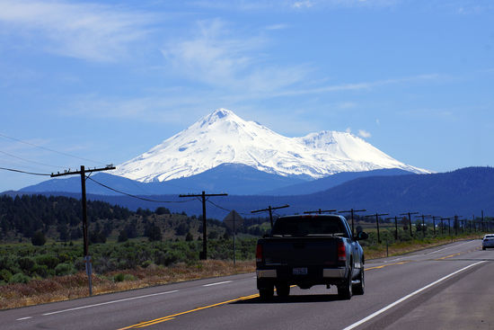 Auf dem Weg zum Lava Bed National Monument sahen wir etwas weißes, pyramidenartiges in der Ferne - was ist das, haben wir uns gefragt? Die Landkarte wurde durchforstet und bähmmm - es ist der Mount Shasta. Schneebedeckt und 4.317 Meter hoch ragt er von weitem in die Höhe. Eigentlich hatten wir eine andere Route zum Lassen Volcanic National Park geplant. Aber irgendwie hat uns der Mount Shasta magisch angezogen. Nun haben wir ihn fast umrundet - er gibt immer wieder andere Ausblicke frei. Anscheinend kann man bei den Wanderungen Schwefelgerüche wahrnehmen. Dies deutet darauf hin, dass er irgendwo in seinem Inneren noch aktiv ist, und wahrscheinlich irgendwann (hoffentlich nicht in den nächsten Tagen ) ausbricht.