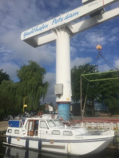 Früh aufstehen, halb 8 losgefahren, kurz vor 9 am Kran der Marina Potsdam angelegt und alles zum Kranen gerichtet. Ging dann auch um 9:35 los und hat gut geklappt.