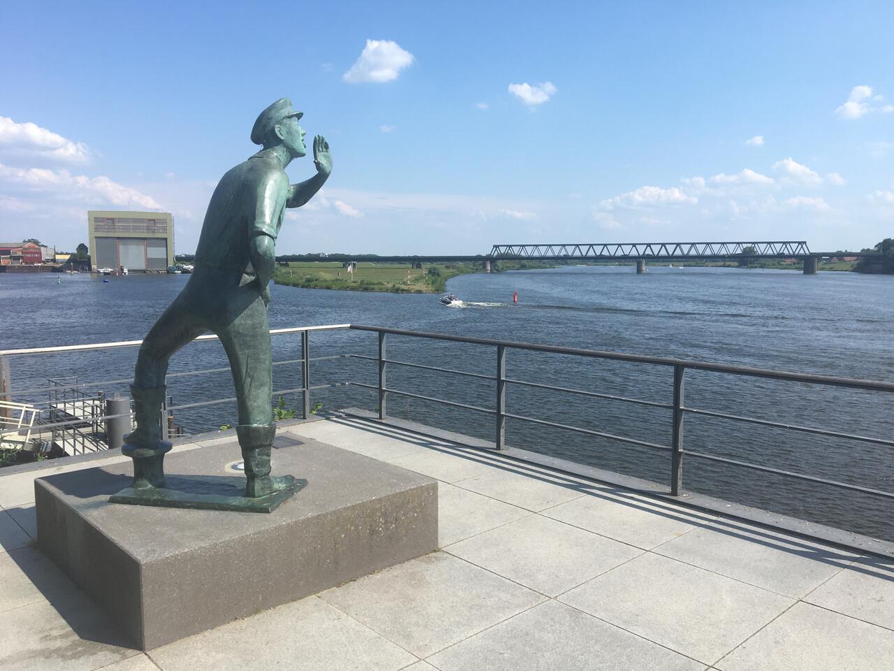 Der Lauenburger Rufer am Ufer der Elbe, das Wahrzeichen der Stadt, der die vorbeifahrenden Schiffe grüßt