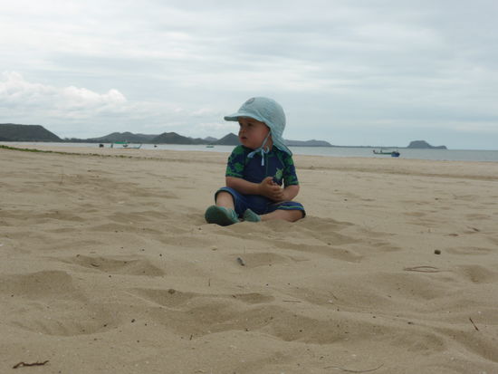 Die Aussicht in den Sam Roi Yot Nationalpark ist wunderschön. Es ist ein kleines Paradies. Wir waren begeistert und werden in den kommenden 3 Wochen nochmal so einen Tag verbringen. Es war zwar wie gesagt stark bewölkt und einmal hat es kurz getröpfelt, aber das war nicht der Rede wert. Einen kleinen Sonnenbrand habe ich mir trotz Wolkendecke eingefangen. Man muss wirklich höllisch aufpassen. Die Wolkendecke lässt einen leichtsinnig werden mit der Sonnenmilch. Mit den Kindern muss man sowieso aufpassen mit dem Ozon. Bastian reisst sich auch immer wieder die Mütze vom Kopf. Das versteht er noch nicht.