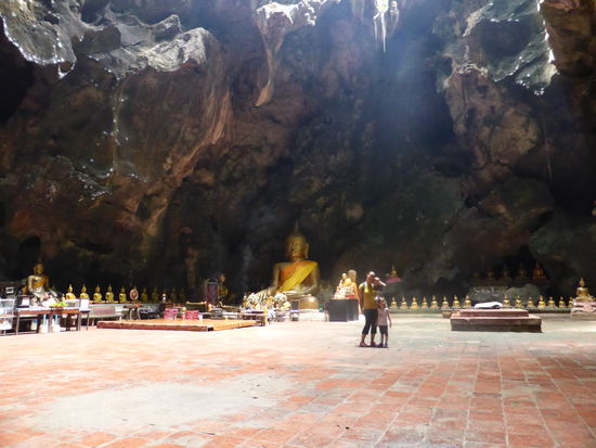 Unser Navi hat uns zielsicher an den richtigen Ort gebracht. Und was sahen wir als Erstes in dem Städtchen. Affen! Hier und da waren sie unterwegs. Die Khao Luang Cave (Höhle) war unser Hauptstopp. Als wir dann unser Auto unterhalb der Höhle abstellten waren dort noch viel mehr Affen. Witzige Gesellen, denen wir aber nicht zu nahe kommen wollten. Schilder am Eingang der Höhle warnen vor dem Füttern. Da absolute Nebensaison ist wollten uns natürlich trotzdem einige Verkäufer auch noch Affenfutter (Bananen und anderes Obst) andrehen... Nein danke!