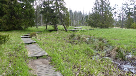 Zuerst laufen wir entlang des "Kaiserweges", dann auf dem Hexensteig und der führt uns geradewegs in das begehbare Hochmoor.