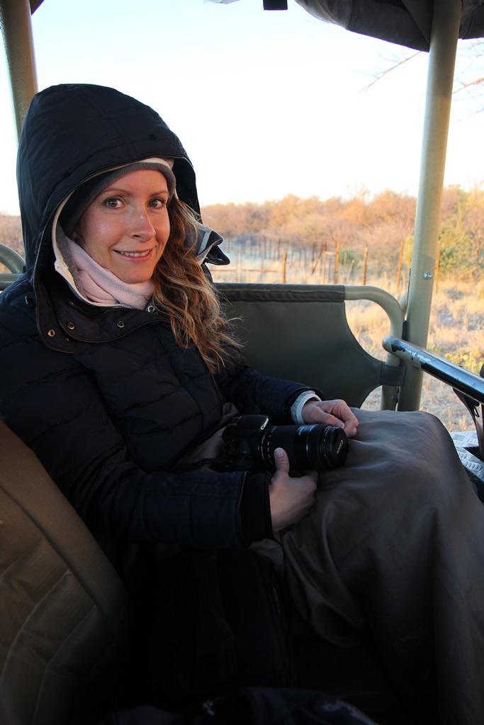 Auf einer morgendlichen Pirschfahrt heißt es: 5:30 Uhr Frühstück, 6 Uhr Abfahrt. Es ist so kalt, dass wir mit Wärmflasche (unser Guide nennt sie "Bush Babies") und einem fleecegefütterten Cape ausgestattet werden - zusammen mit Skiunterwäsche und Daunenjacke ergibt das die perfekte Ausstattung für ungetrübten Outdoor-Spaß im Safari-Auto.