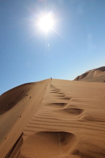 ...und erklimmen einige Höhenmeter von "Big Daddy" - die Düne direkt über dem Deadvlei - einer bizarren, ausgetrockneten Salzpfanne. Der Aufstieg auf so einen Sandberg ist sehr mühsam - der Abstieg entgegen dauert nicht mal eine Minute. Man springt den steilen Hang einfach hinab - ein Rießenspaß!