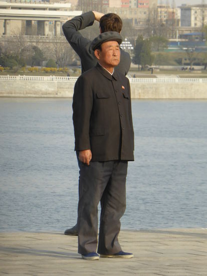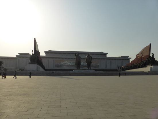 Nun stehe ich vor den 20 Meter hohen Bronzestatuen der Herrschaften, von denen noch des Öfteren die Rede sein wird, Kim Il-Sung, dem Staatsgründer und seinem Sohnemann, dem zu Lebzeiten recht unscheinbar wirkenden, aber nun mit seinen 20 Metern sehr imposanten Kim Yong-Il.