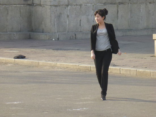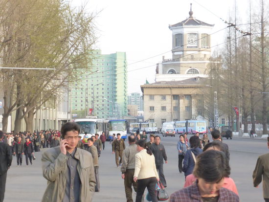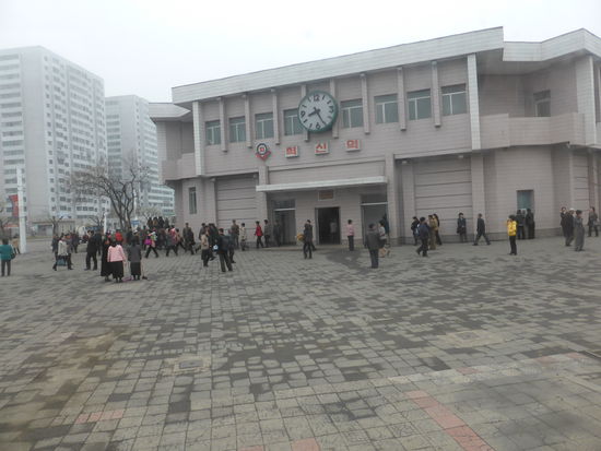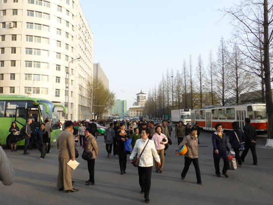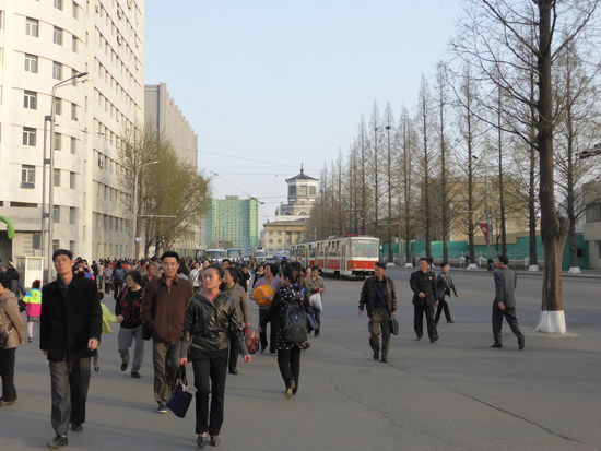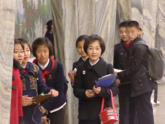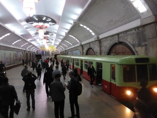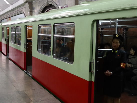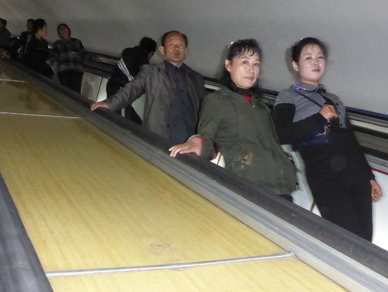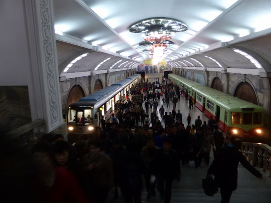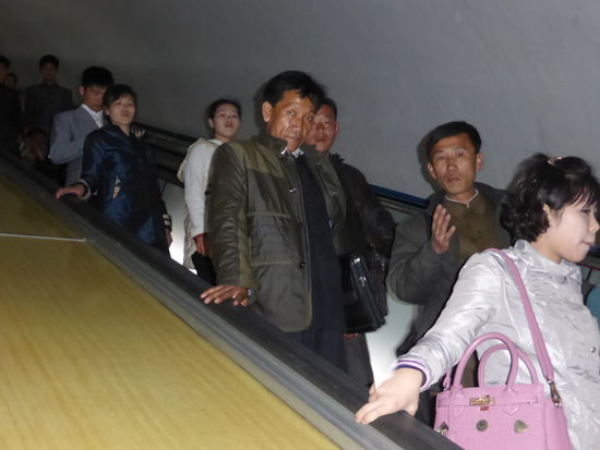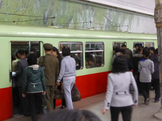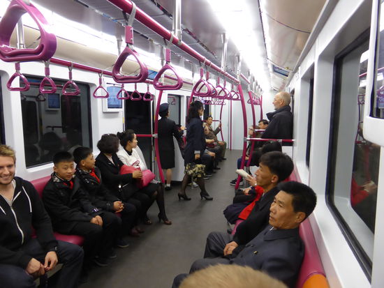 Früher wurde wohl für die Touristen ein eigener Waggon –die meisten entstammen der Westberliner U-Bahn und wurden in Nordkorea nur umlackiert und mit Kim-Bildern behängt- reserviert; heute dagegen dürfen sie sich unter das gemeine Volk mischen. Unser Wagen ist nur spärlich besetzt, die Leute gucken genauso mürrisch oder gelangweilt wie bei uns zuhause in der Bahn.