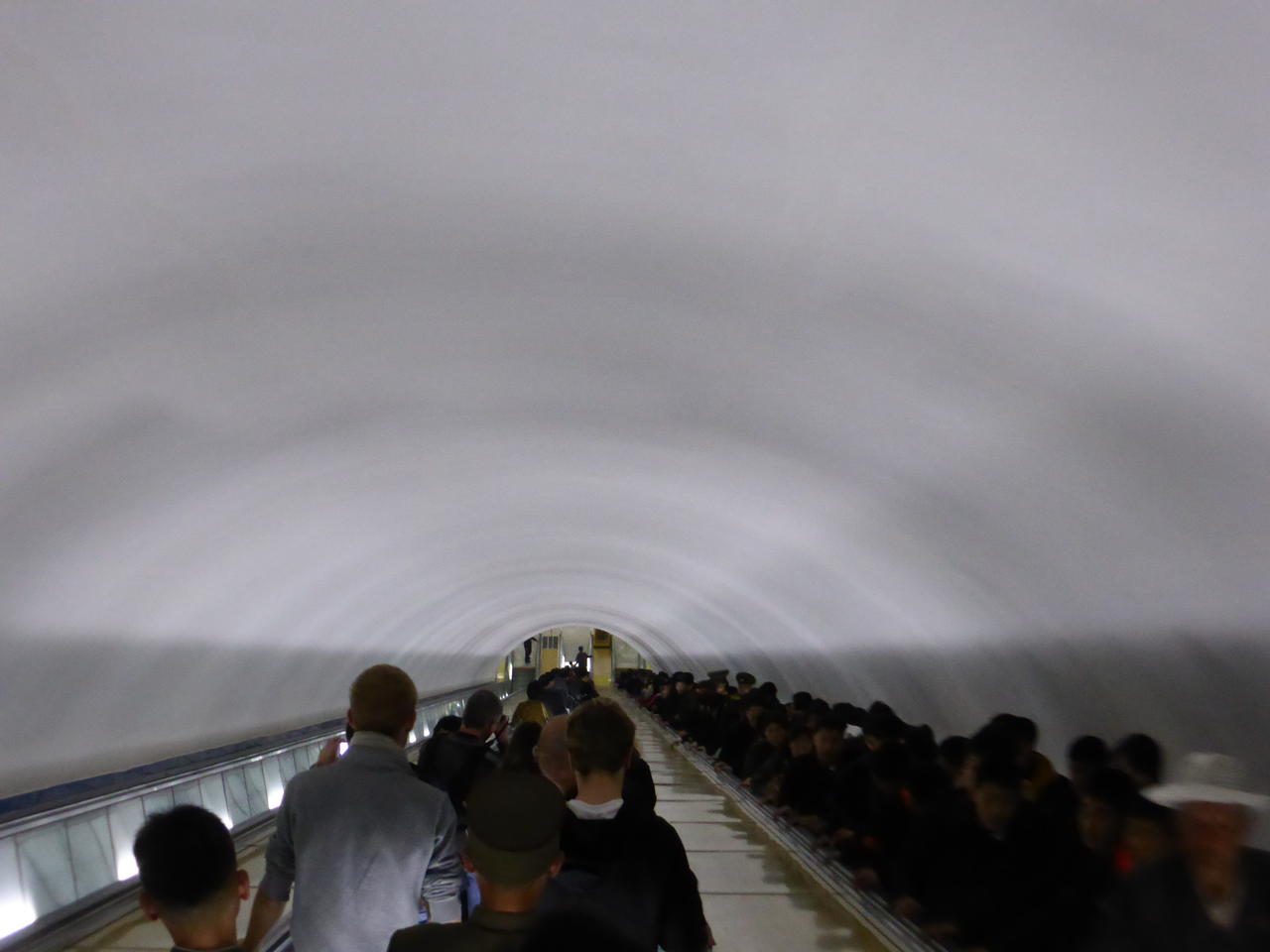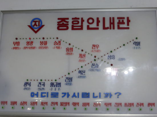 Das U-Bahn System Pyongyangs ist „sagenumwoben“. Es umfasst zwei Linien, verläuft komplett unter der Erde, und zwar überwiegend ganz tief, ca. 100 Meter. Warum wohl ? Man vermutet, dass die Tunnel im Ernstfall auch als Schutzbunker dienen sollen und das Tunnelsystem weit über die U-Bahn Nutzung hinausgeht. Ganze Militäranlagen sollen sich dort befinden, ja, im Prinzip soll die ganze Stadt untertunnelt sein. „Genaues weiß man nicht“. Das Motto gilt aber eigentlich für alles was mit Nordkorea zu tun hat.