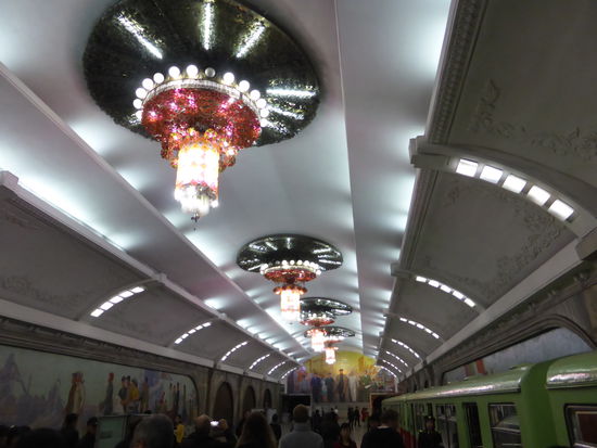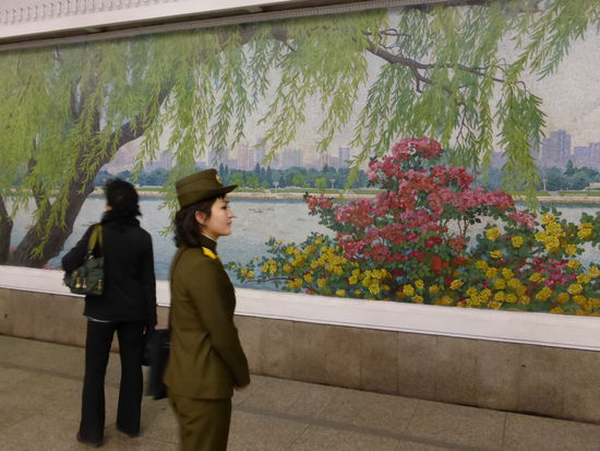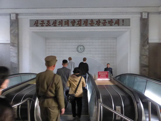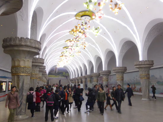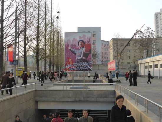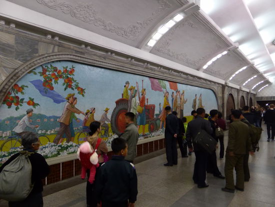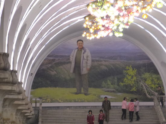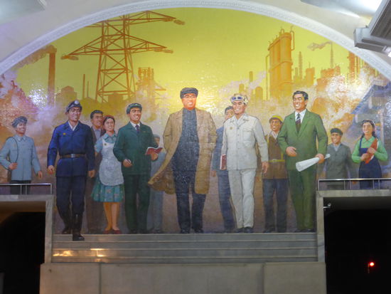 Die beiden von uns besuchten Stationen, in Puhung steigen wir ein, in Yonggwang aus, sehen pompös aus und machen ordentlich was her. Sie sind mit den luxuriösen Moskauer U-Bahn-Stationen vergleichbar (Achtung: Hörensagen, ich war noch nie in Moskau), riesig, breit, hoch, hell, freundlich, von den Decken hängen Lüster, riesige Gemälde und Mosaike begeistert arbeitender Menschen bei schönstem Sonnenschein und blühender Landschaften an den Wänden. Und –natürlich- Papa und Sohnemann Kim dürfen auch nicht fehlen. Wobei, aus heutiger Sicht handelt es sich ja genaugenommen um Opa und Papa. Aber den „Ewigen Präsidenten“ als Opa zu bezeichnen … ich weiß nicht ob das den Nordkoreanern wirklich gefallen würde.