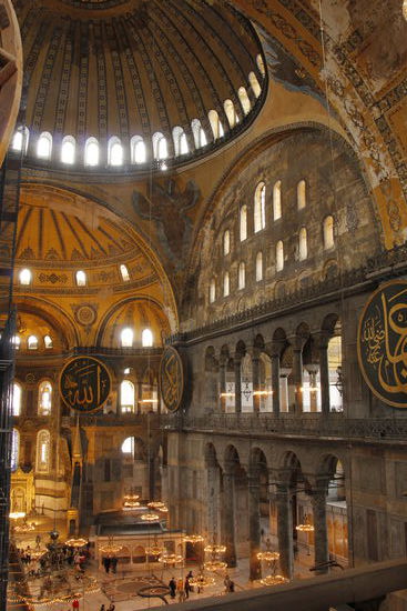 Als Kuppelbasilika errichtet, setzte sie im Zeitalter Justinians I. im 6. Jahrhundert n.Chr. neue architektonische Akzente. Indem erstmals eine Kuppel mit 32m Spannweite auf nur vier Auflagepunkten einen zentralen Raum überdeckte, gilt die Hagia Sophia allgemein als eines der großartigsten Gebäude aller Zeiten.