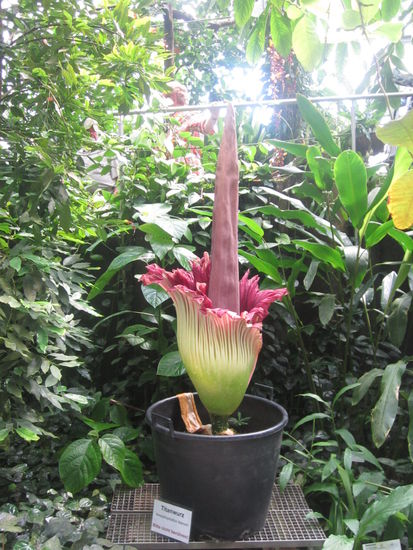 Die Titanwurz (Amorphophallus titanum), ein Aronstabgewächs aus den Regenwäldern Sumatras, bringt die größte Blume der Welt hervor.