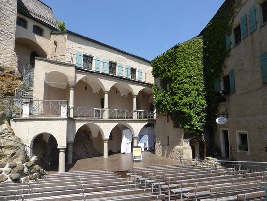 Eigentlich war heute wieder Golf an der Reihe, aber ein Blick auf Weather-pro zeigt, dass es bereits um 10.00 Uhr 28 Grad werden soll. So lasse ich meine Frau noch etwas weiter schlafen und nach dem Frühstück gammeln wir noch etwas rum, so dass wir nach meinen ausführlichen Recherchen auf der Terrasse zunächst die Burg Falkenstein ansteuern, auf der morgen die Premiere eines Sommertheaterstücks (Alice im Wunderland) aufgeführt werden soll.
