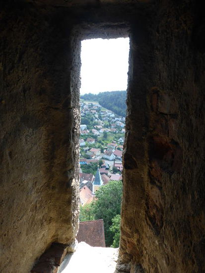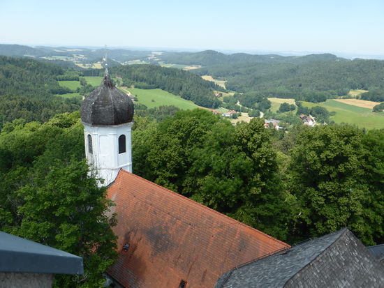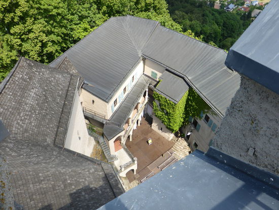 An der Burg sind die Vorbereitungen noch im Gange, die Kirche geschlossen und nur der Turm zu besteigen. Meine Frau mag diese Strapazen ja nicht unbedingt und bleibt auf der Tribüne sitzen. Ich genieße den Rundumblick von oben, nachdem ich ein Drehkreuz mit 50ct freigeschaufelt habe.