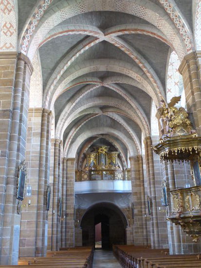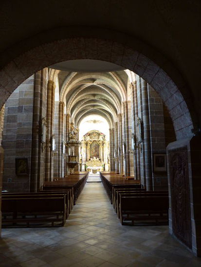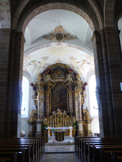 Über eine schöne Nebenstrecke mit einigen Höhenzügen fahren wir dann wieder ins Tal der Regen nach Walderbach, wo eine für Bayern seltene romanische Basilika steht, die auch noch einige wirklich alte Elemente aus der romanischen Epoche enthält, obwohl vieles geändert wurde und Teile im Rokoko \ Barock ausgeschmückt wurden. Alt sind, das Portal mit Kapitell, die Reste eines Deckengemäldes in der Vorhalle.