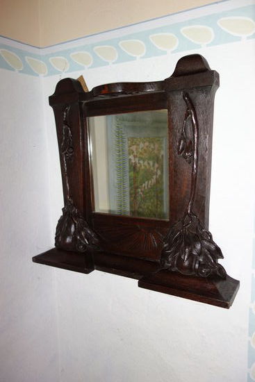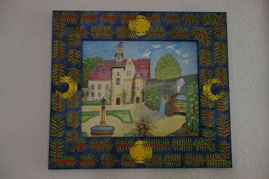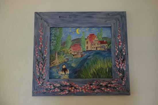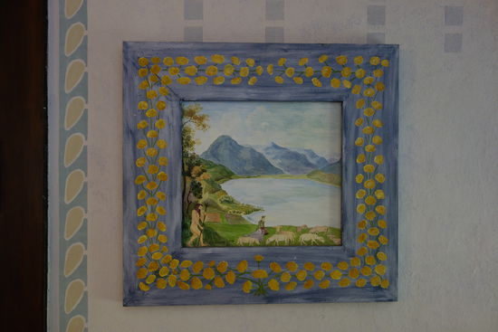 andere Holzrahmen mit aufwändiger Dekoration neueren Datums passen recht gut zu den präsentierten Bildern (z.T. im Stil der naiven Malerei )