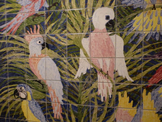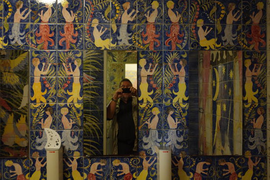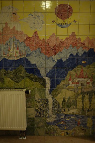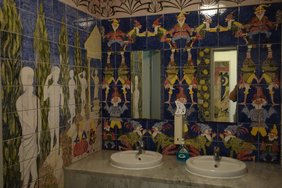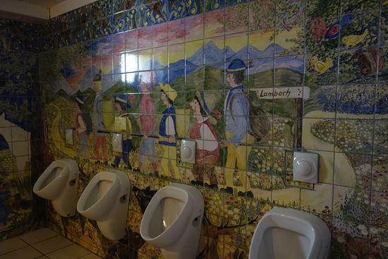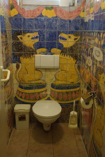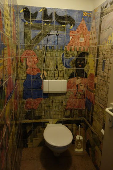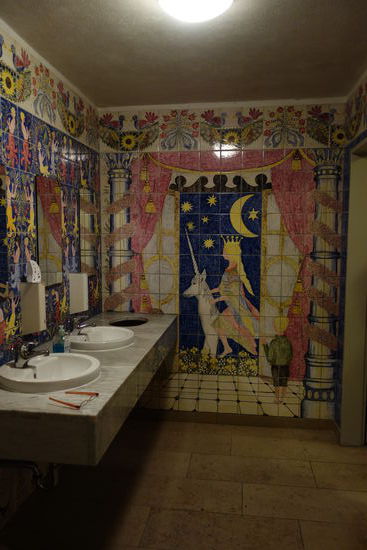 Ein besonderes Highlight erwartet uns dann noch am Ende des Rundganges. Auf sämtlichen Wänden der Toiletten- und Waschräume befinden sich 5.000 Fliesen, die Stück für Stück von Hand mit Märchenmotiven bemalt wurden. Sie dürften in ihrer Art einzigartig sein.