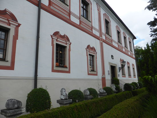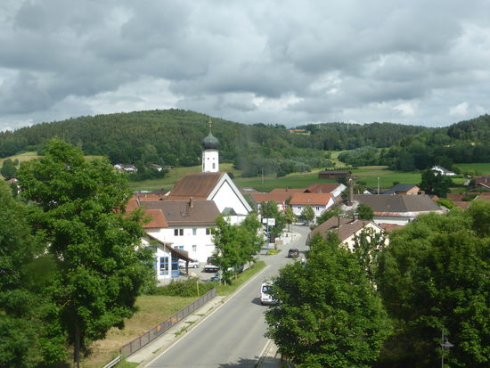Ein Blick vom Schloß auf die Kirche von Miltach beschließt unseren Rundgang, der uns sehr gefallen hat. Im Schloßladen wird meine Frau Ulrike noch mit einigen Handarbeitsgegenständen fündig. Nach Aussage der Schloßbesitzerin finden die anderswo genannten Jazzkonzerte leider nur in der Wintersaison statt.
