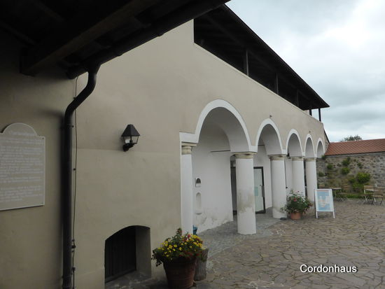 Ein weiterer Rest der ehemaligen Stadtmauer grenzt an den Hof eines alten Probsteigebäudes des Kloster Reichenbachs. Der heutige Name Cordonhaus stammt aus dem französischen - eine Kette militärischer Posten zur Sicherung der Grenzen. Heute sind dort die Touristeninformation und ein kleines Museum untergebracht. Dort erhalten wir eine Reihe von Prospekten für die nächsten Tage in der Umgebung. Die Dame hilft mir bei meiner Frage nach einer geologischen Besonderheit der Gegend. Sie druckt mir mangels eines Prospektes ein Papier aus dem Internet aus.