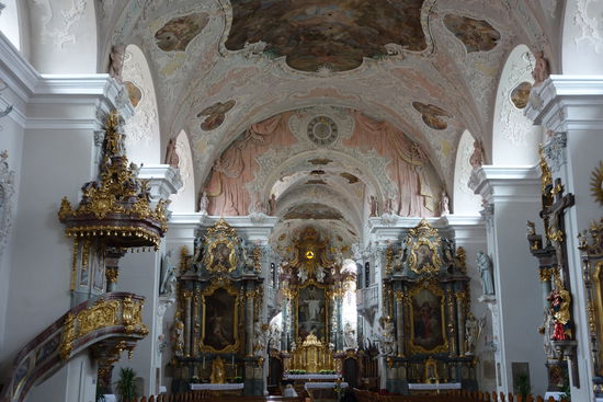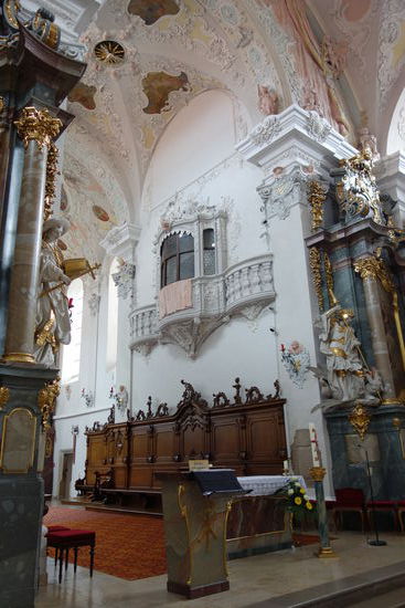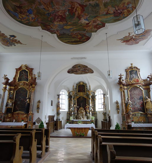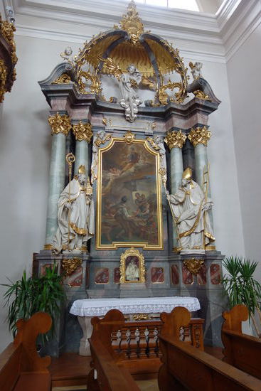 Die beiden Nebenaltäre der Spitalkirche sind den Kranken gewidmet Der rechte Seitenaltar zeigt die 14 Nothelfer, begleitet vom heiligen Bartholomäus und vom heiligen Ignatius Über dem Bild ist der heilige Stephanus zu sehen. Im linken Seitenaltar wind der Tod des heiligen Josef dargestellt der den Gläubigen eine glückliche Sterbestunde verheißt