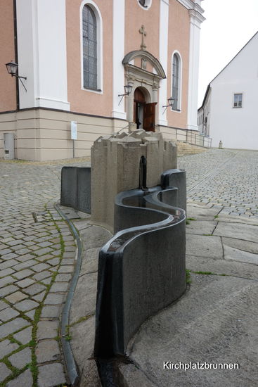 Auf dem Kirchplatz befand sich schon in früheren Jahrhunderten ein Brunnen zur Versorgung der Bevölkerung. Beweise dafür fand man bei der Neugestaltung des Platzes im Jahr 1990. Damals stieß man auf einen alten Brunnenschacht, der noch frisches klares Wasser führte. Der neue Brunnen hat für die Wasserversorgung längst keine Bedeutung mehr. Er dient nur zur reinen Zierde. Der in Cham geborene Künstler Sebastian Roser fertigte ihn im Jahr 1991 an. Der Brunnen symbolisiert die topographische Lage der Stadt, die auf einem Bergvorsprung stehend das Regental prägt.